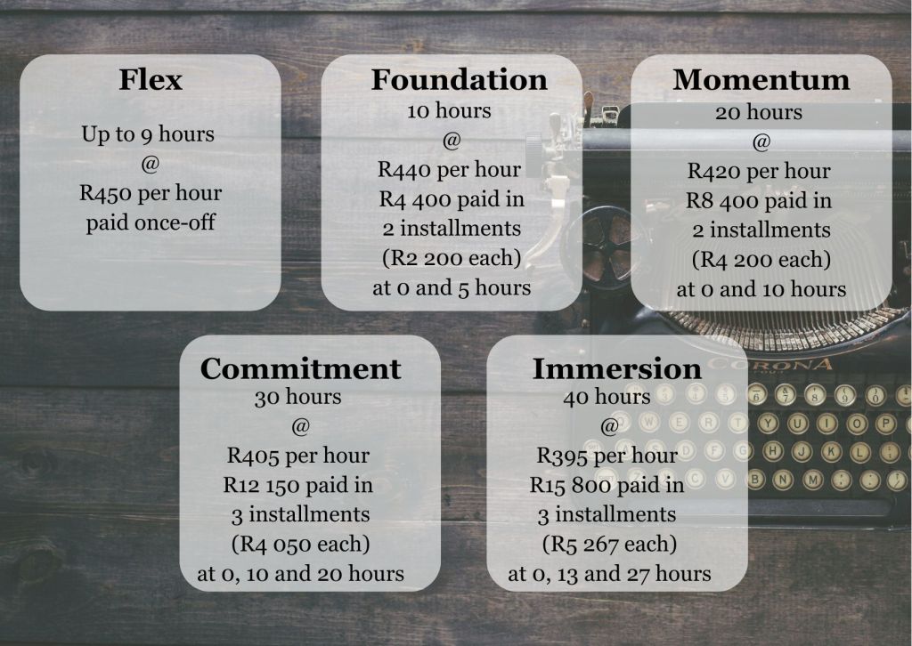 Fees are structured to offer clients the freedom to adjust the writing process to their time constraints, without losing momentum or sacrificing accountability.